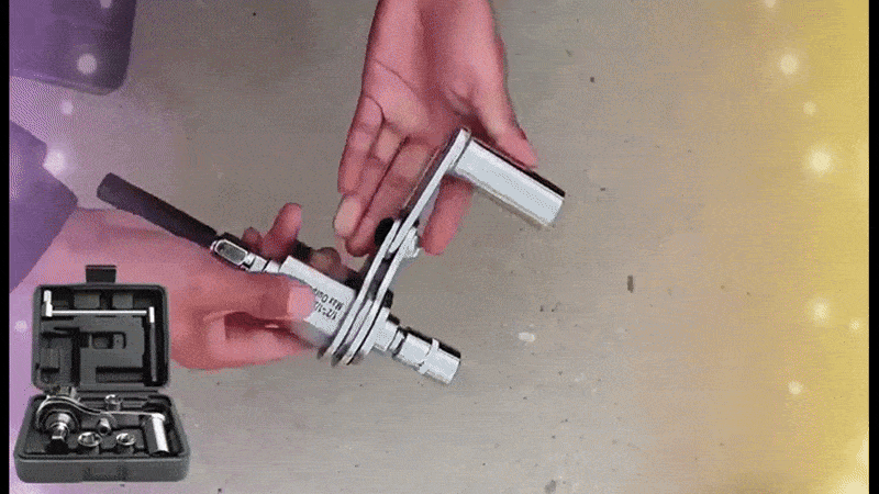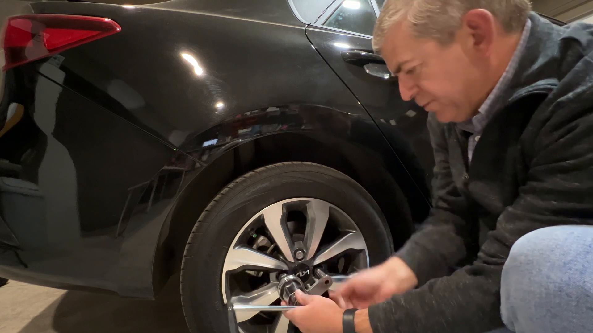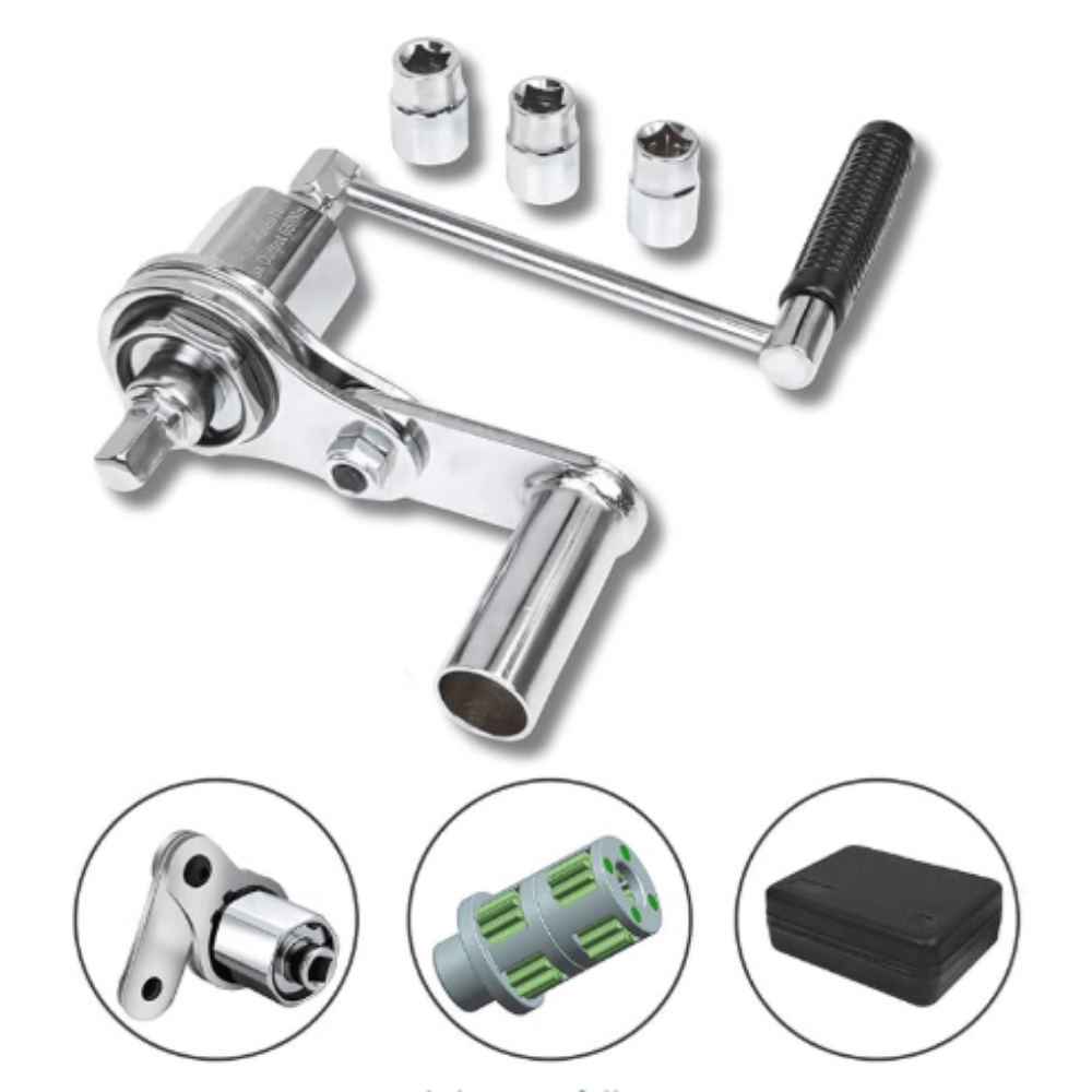 Ta av håndtaket og pipa fra mutter løseren og bruk sveiva rett på skru pipa og skru hjulboltene/mutrene ut.